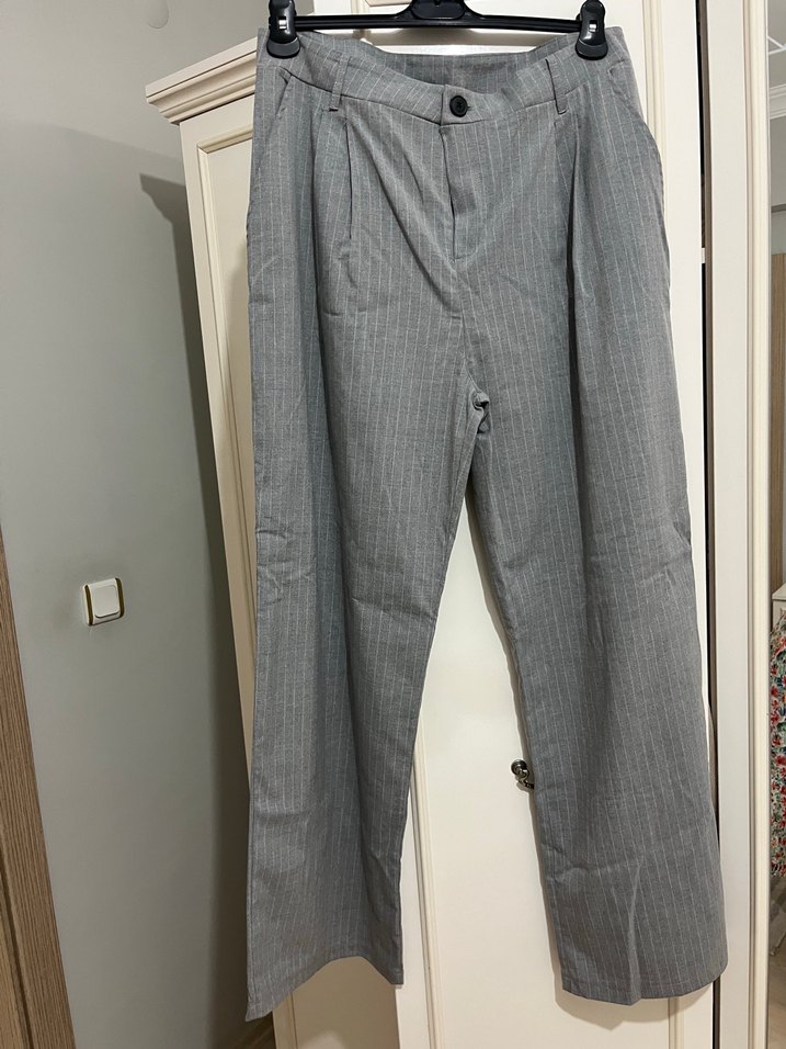 Gri Pilili Kadın Keten Kumaş Pantolon
