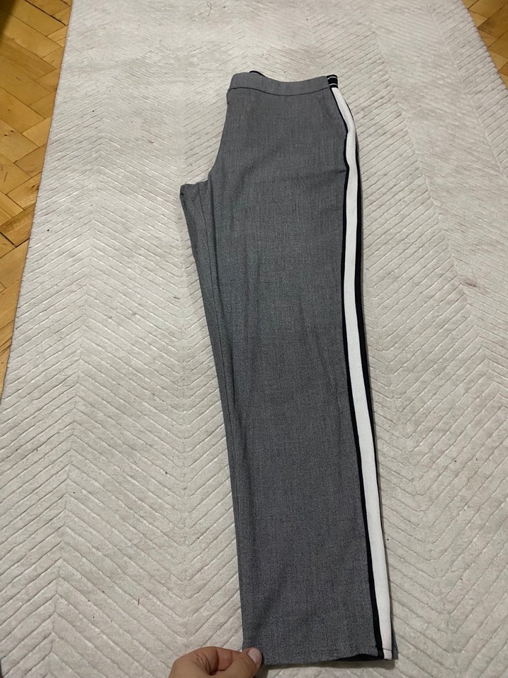 Gri renk, pilili, sentetik kumaştan kadın kumaş pantolon. Normal boy midi kesim ve beyaz yan şerit detaylıdır. Günlük rahat stil için uygundur.