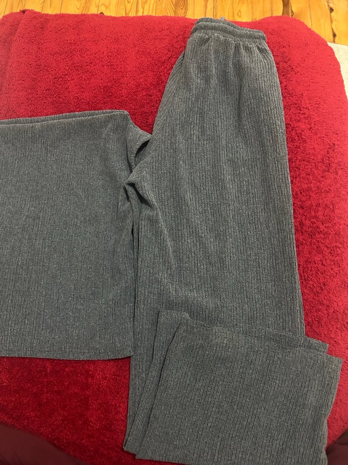 Gri renkte, pilili ve düz kesim kadın pantolon. Yumuşak sentetik kumaştan yapılmış, maxi boyda ve rahat dış mekan kullanımı için uygun.üst ile beraber