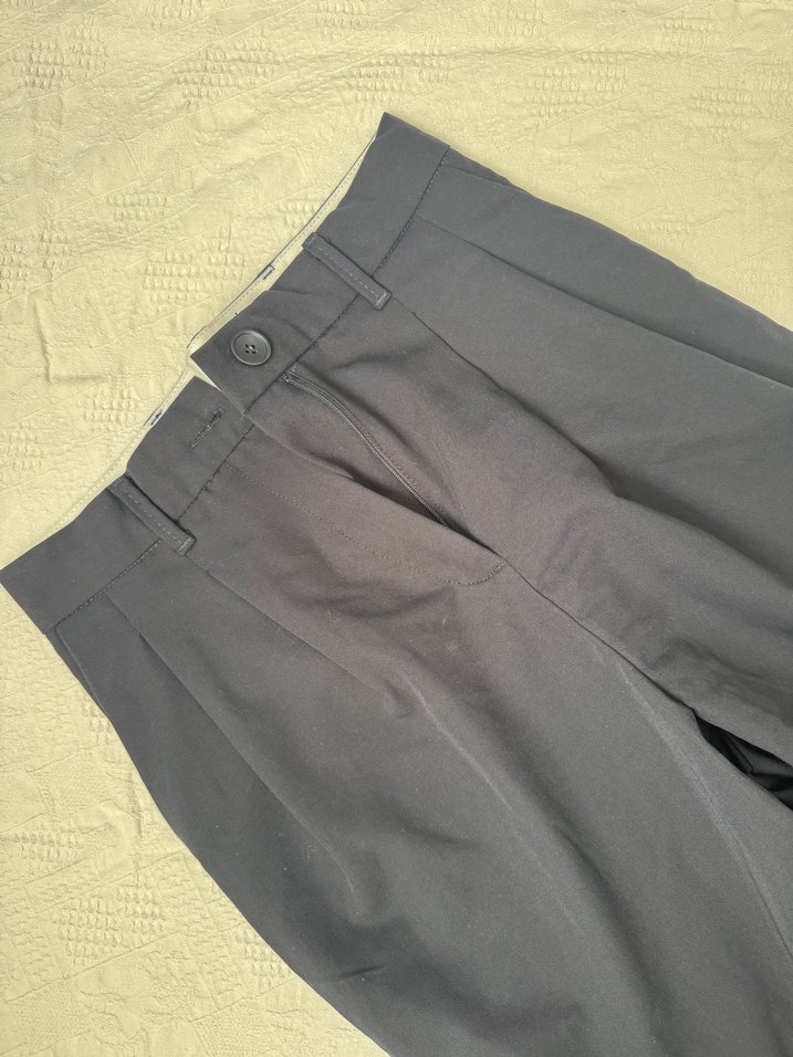 Gri renkte, pilili ve midi boyda kadın kumaş pantolon. Düz kesim, sentetik yumuşak kumaştan, ofis şıklığı için uygun minimal tarzda.