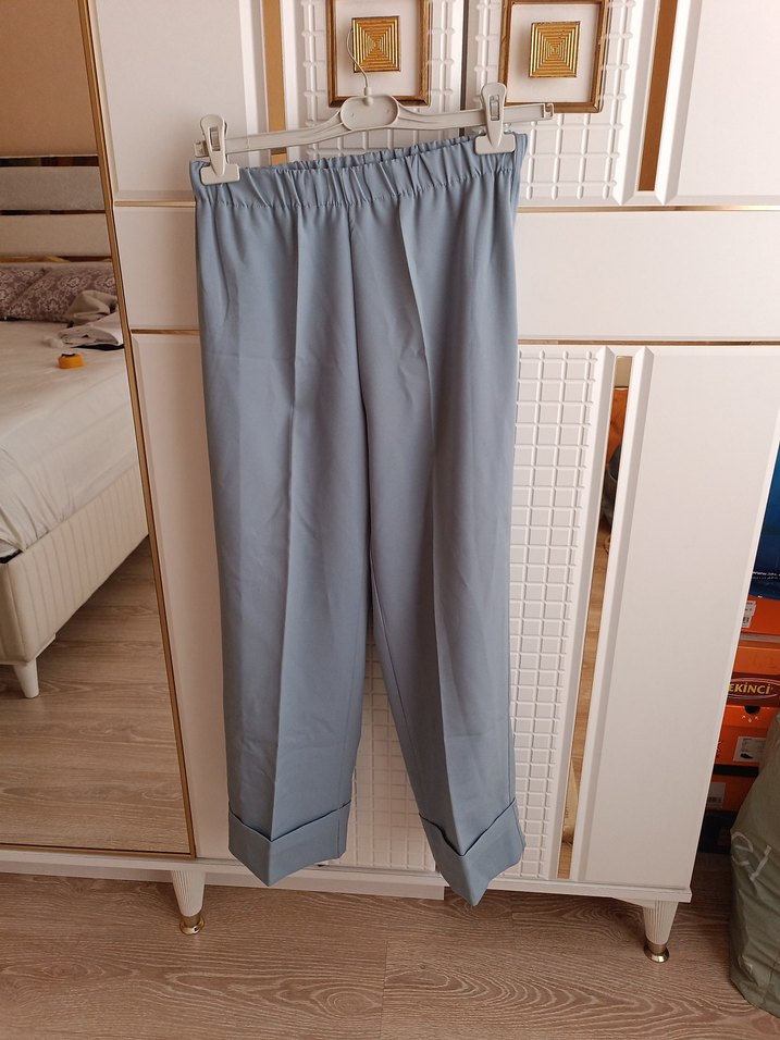 36 beden 93 cm paçalari kendiliğinden katli Gri renk, midi boy, pilili ve düz kesim kadın pantolon, ofis kullanımı için uygun yumuşak sentetik kumaştan üretilmiştir.