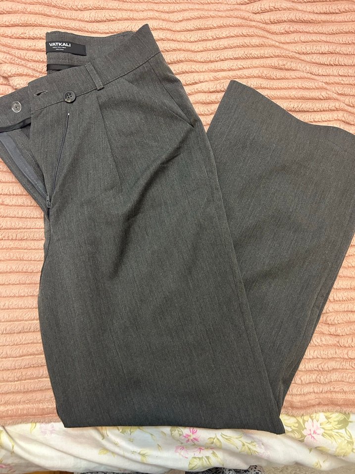 VATKALI Gri renkte, pilili ve midi boyda, sentetik kumaştan üretilmiş, normal kalıpta kadın kumaş pantolon. Ofis kullanımı için uygundur.