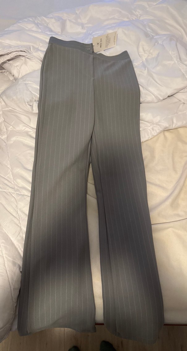 Gri renkte, pilili, normal boyda kadın kumaş pantolon. Ofis için uygun, rahat kesimli ve trend casual tarzda, sentetik kumaştan üretilmiştir.