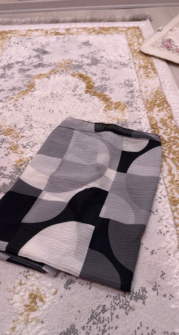 Kadınlar için gri tonlarda, pilili dokusuyla modern desenli kumaş şal. Rahat ve şık, avant-garde tarzı sevenlere uygun.
