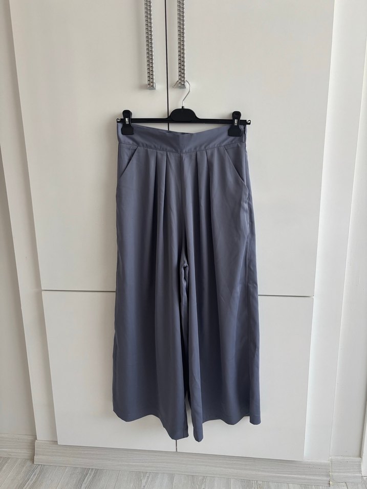Gri kumaştan, pilili ve bol kesim midi uzunluğunda kadın pantolon. Minimalist ve normcore tarzıyla günlük kullanıma uygundur.