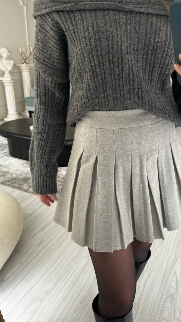 Gri renkte, pilili ve triko kumaştan mini etek. Rahat kesimi ve midi boyu ile günlük kullanıma uygun, normcore tarzda bir parça. 2 kez gıyıldı.