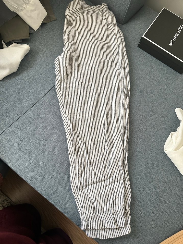 Gri keten kumaştan, pilili ve midi boyda, bol kesim kadın pantolon. Rahat ve günlük kullanıma uygun.