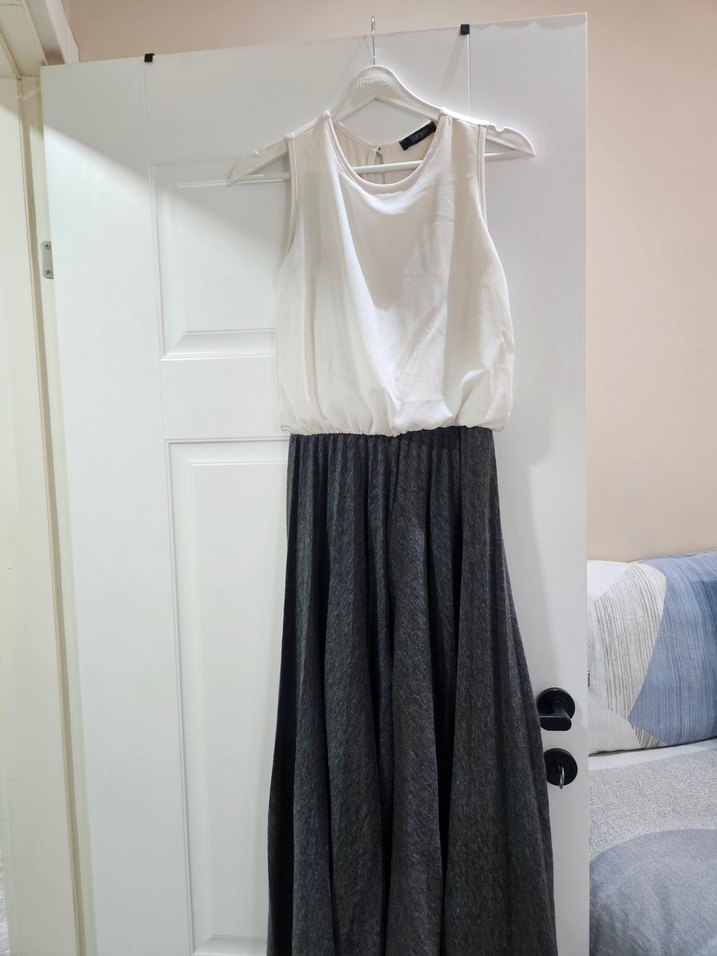 Bol kesim, pilili midi uzunlukta tulum. Yumuşak keten kumaştan, minimalist ve normcore tarzda, gündelik kullanım için ideal gri renkte.