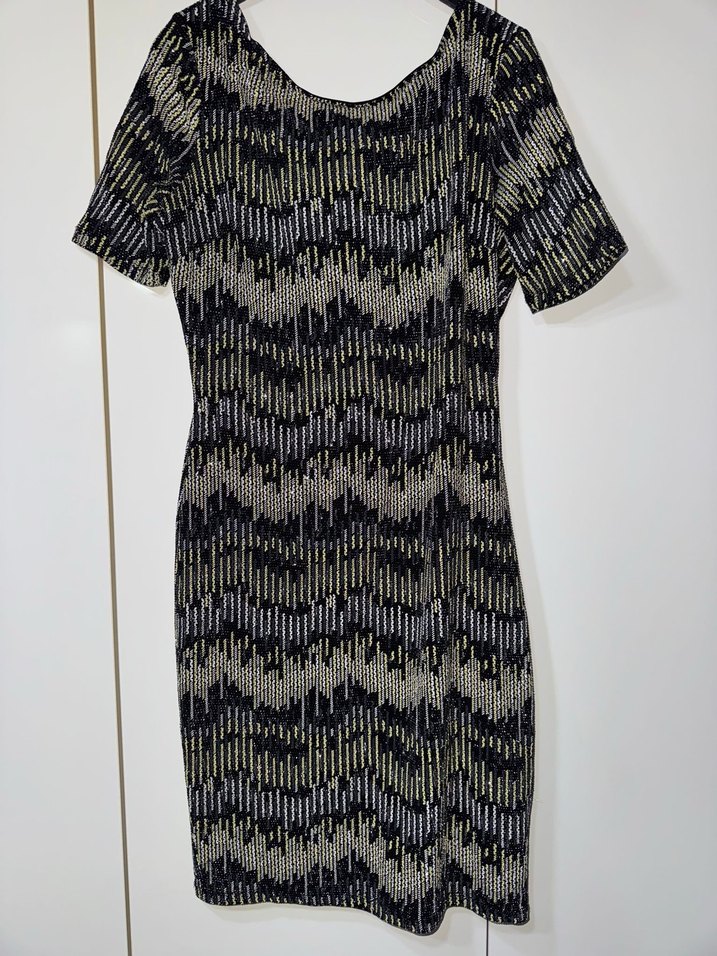 Gri tonlarında desenli, pilili, kısa kollu, tekne yaka ve vücuda oturan midi elbise. Ofis için uygundur.