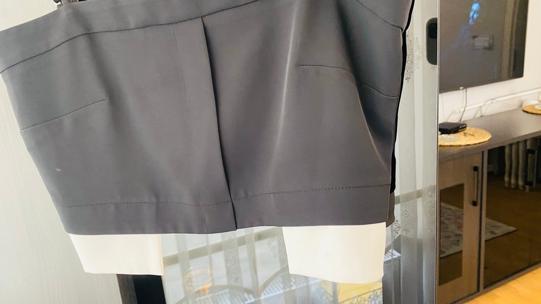 Gri renkte, pilili ve midi . Düzgün sentetik kumaştan yapılmış, iş ortamına uygun çağdaş tarzda.