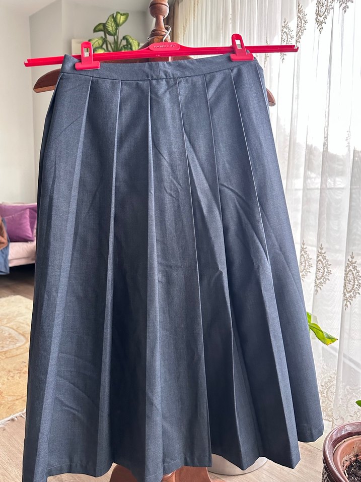Gri renkte, pilili ve midi boyda, sentetik kumaştan yapılmış düzenli kesim kadın etek. Ofis için uygun, normcore tarzında ve şık bir parça. Boy: 75cm Astarlı Cepsiz