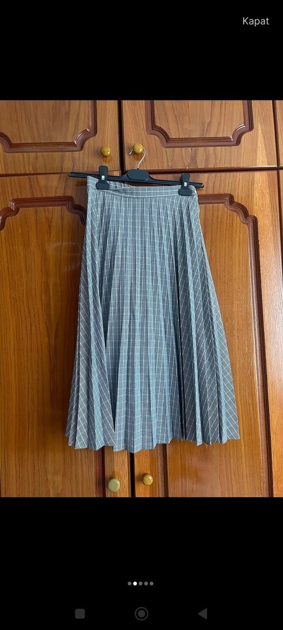 Gri midi uzunlukta, pilili ve düz desenli kadın eteği. Sentetik kumaştan üretilmiş, günlük kullanıma uygun vintage tarzda.