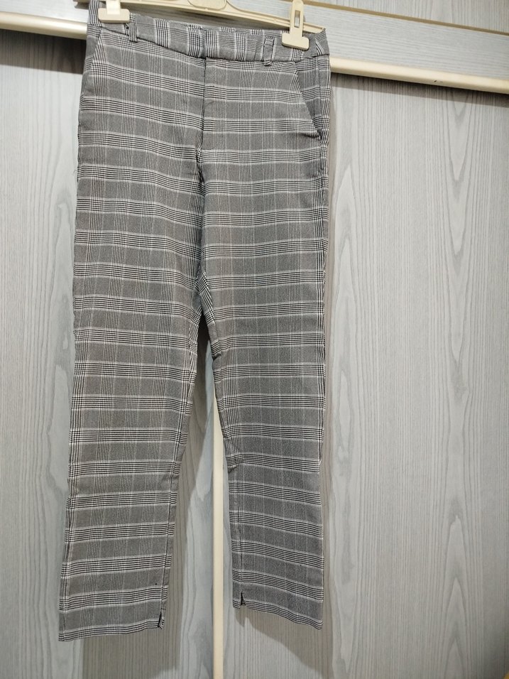 Gri, pilili, midi boy kadın pantolon. Normal kesim, ince kare desenli, ofis kullanımı için uygun, sentetik kumaştan üretilmiştir.