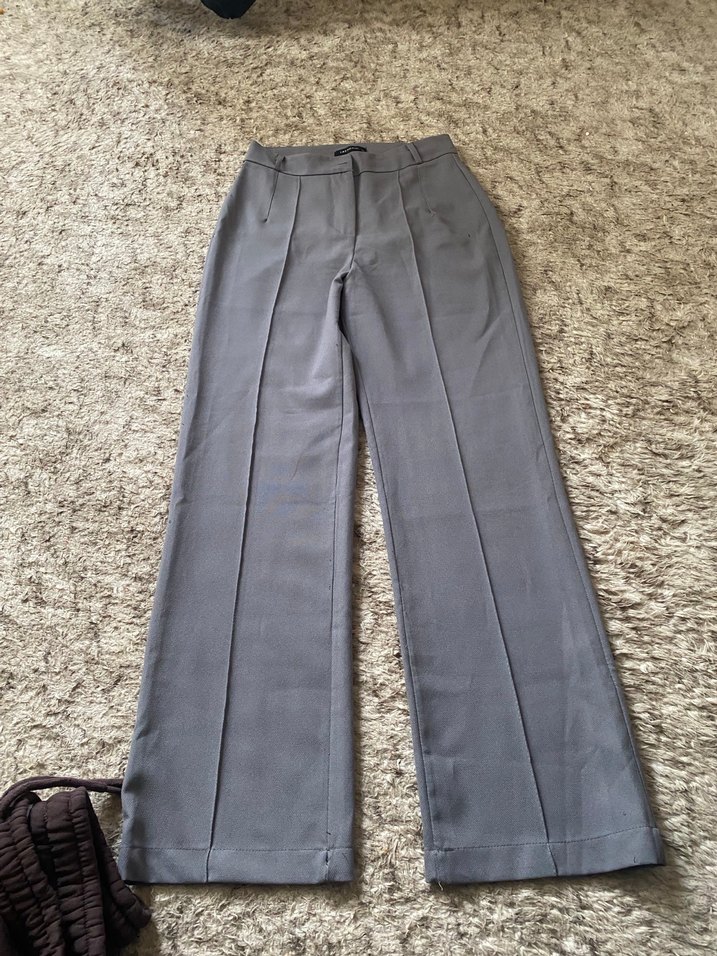 Gri renkte, pilili ve midi boyda, sentetik kumaştan üretilmiş, regular fit kadın pantolon. Ofis kullanımı için uygundur.