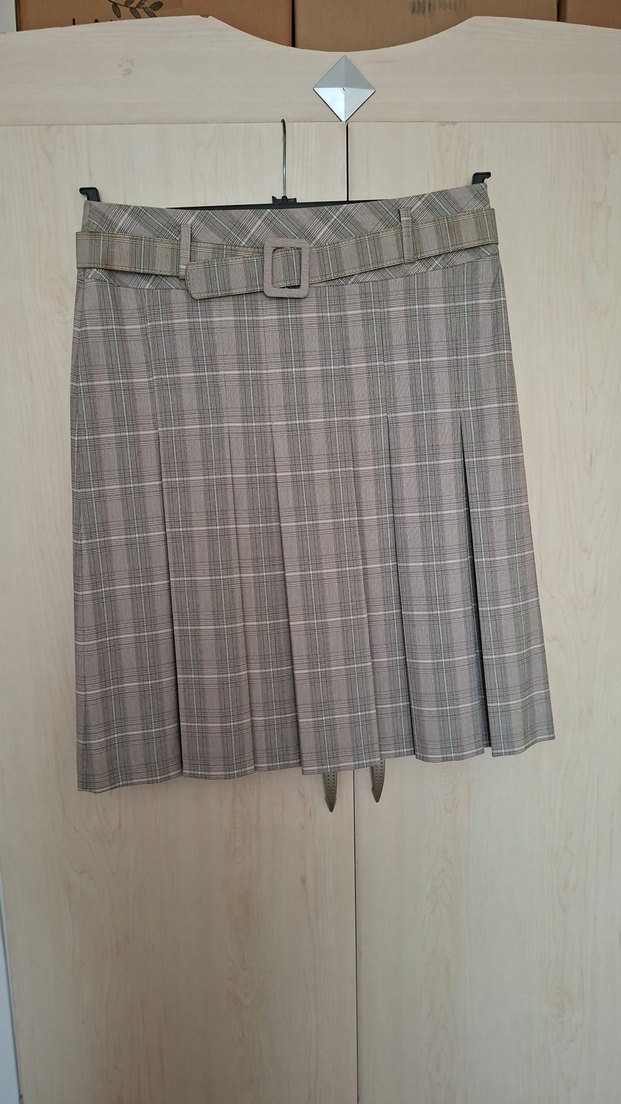 Gri renkte, pilili ve kemerli bel detaylı mini etek. Sentetik kumaştan, ofis için uygun, sokak stili etkisi taşıyor.