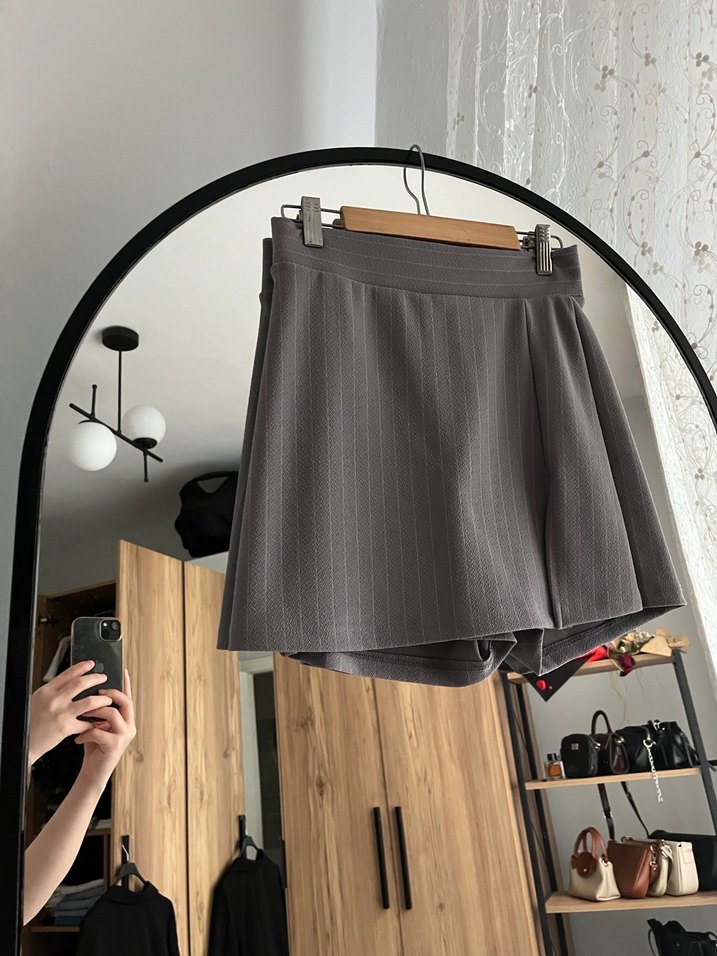 Gri renkte, pilili ve ince kesim mini etek. Suni kumaştan, minimalist ve sokak tarzına uygun, günlük kullanım için ideal.