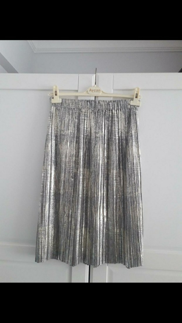 Gri renkte, pilili ve bağlama desenli, sentetik kumaştan üretilmiş bol kesim mini etek. Parti ve bohem tarzlar için uygundur.