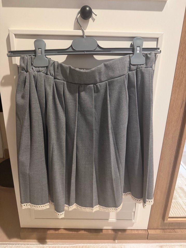 Gri renkli, pilili ve dantel detaylı, rahat kesim kadın eteği. Yumuşak kumaştan üretilmiştir. Kullanılmadı marka temsılı butıkten alındı