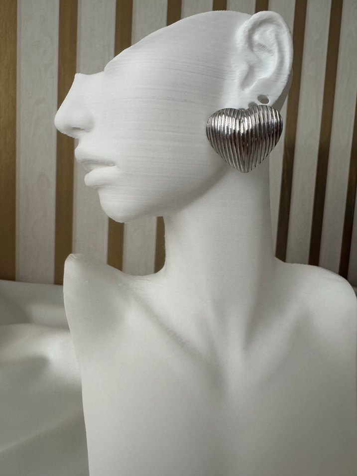 Pilili çizgili desene sahip kısa gri kalp şeklinde küpeler, romantik buluşmalar için ideal. Avant-garde ve çağdaş tarzda, trend belirleyiciler için.