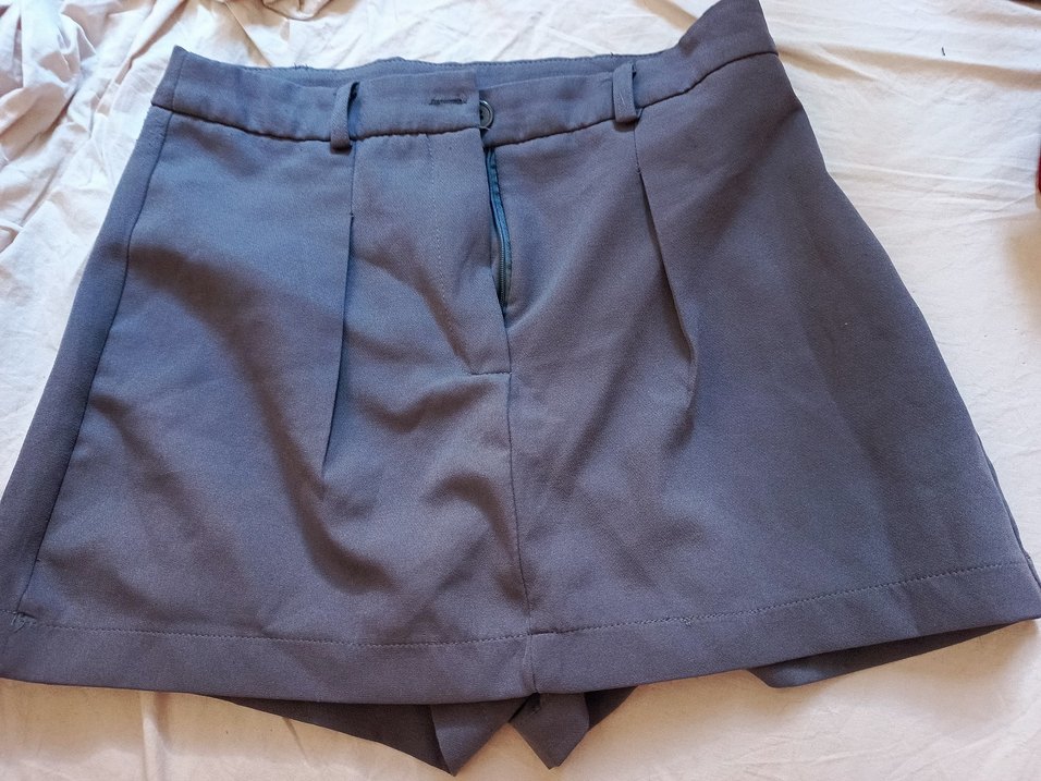 Gri renk, pilili ve mini boyda, şort etek. Düz ve yumuşak sentetik kumaştan, ofis kullanımı için uygun minimal tarzda.