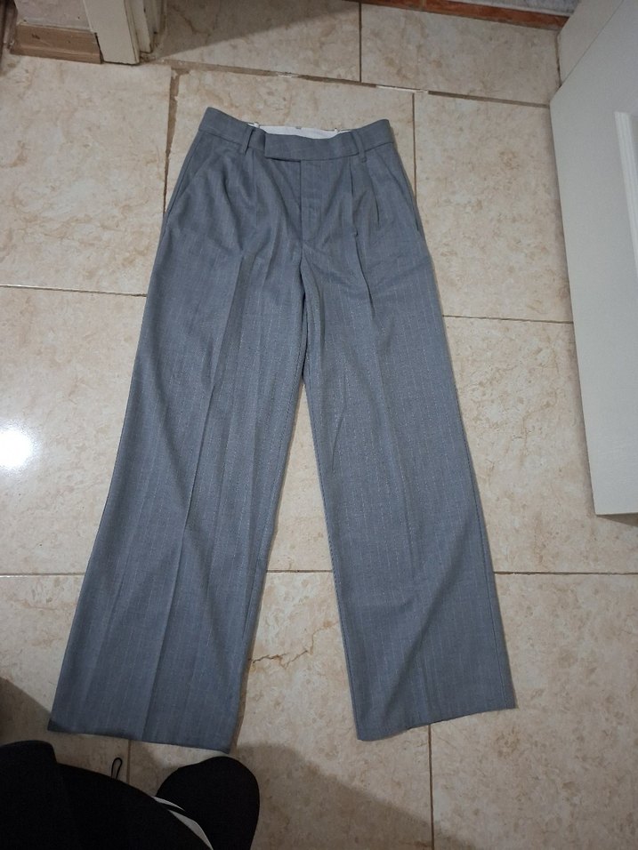 Gri renkli, pilili ve normal boy erkek pantolon. Denim kumaştan, düzenli kesimle ofis ve günlük iş stiline uygun.