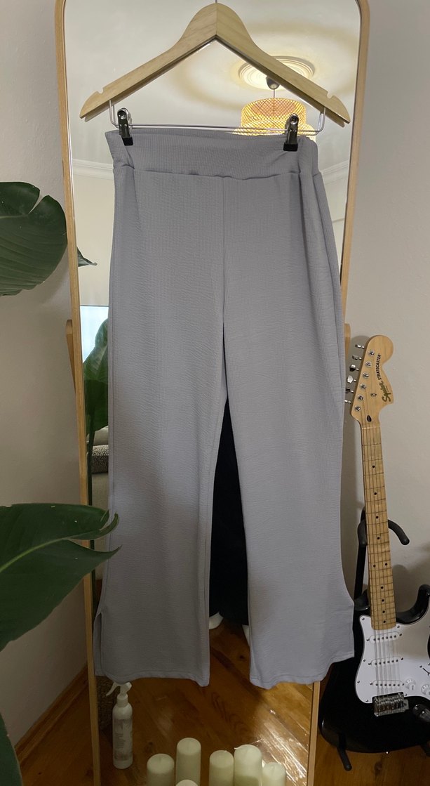 Gri renkte, pilili ve bol kesim midi uzunlukta kadın kumaş pantolon. yumuşak sentetik kumaştan üretilmiştir.