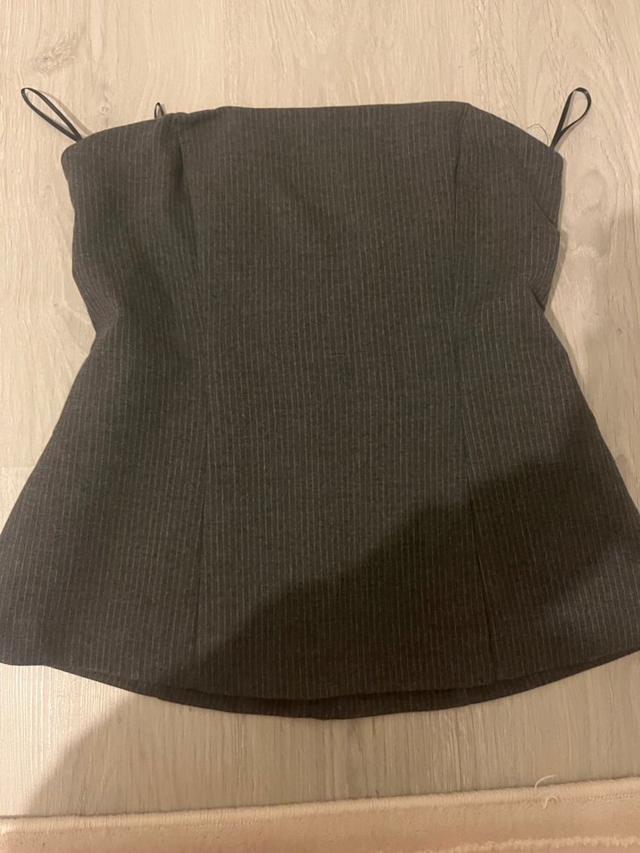 Gri renkli, straplez ve pilili tasarıma sahip kadın üst. Düz ve sentetik kumaştan, midi boyda ve ofis kullanımı için uygun. Kolsuz ve modern tarzda bir parça.