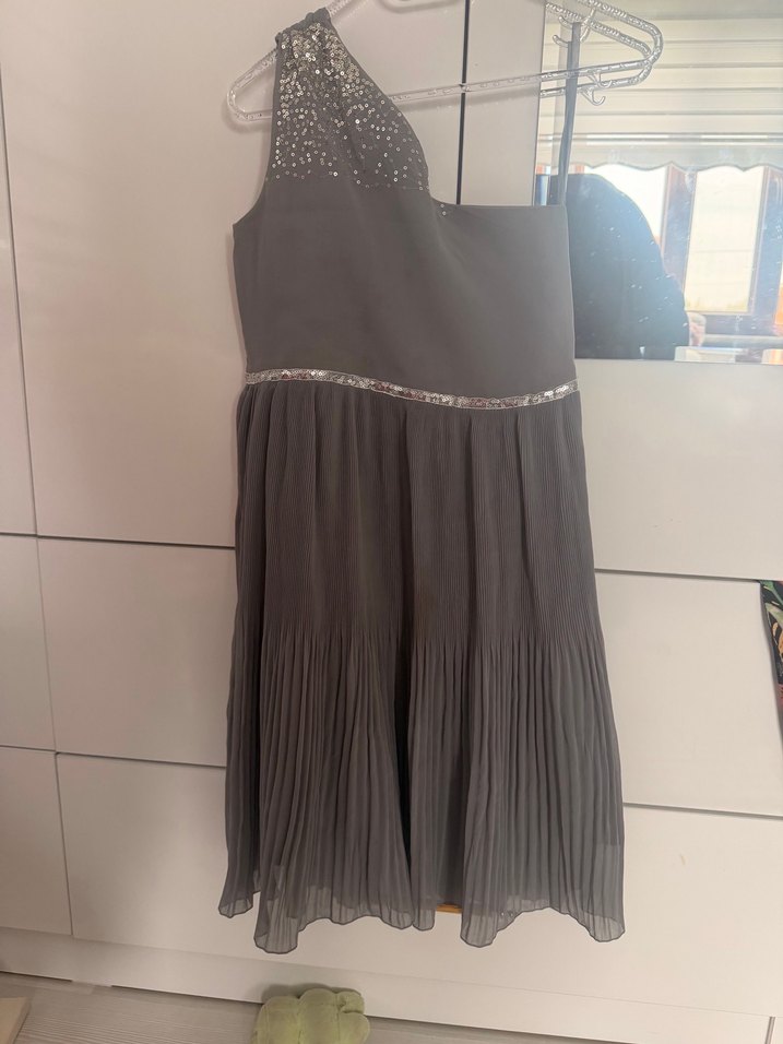 Straplez yaka, pilili midi etekli, vücuda oturan gri abiye elbise. Düğünler için uygun, şık ve zarif görünümlü.