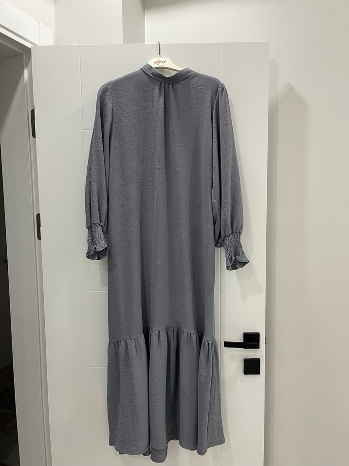 Gri renkli, uzun aerobin kumaş elbise yüksek yakalı, pilili manşetli uzun kollu ve salaş kesimdir. Minimalist ve sade tasarımıyla günlük kullanıma uygundur.