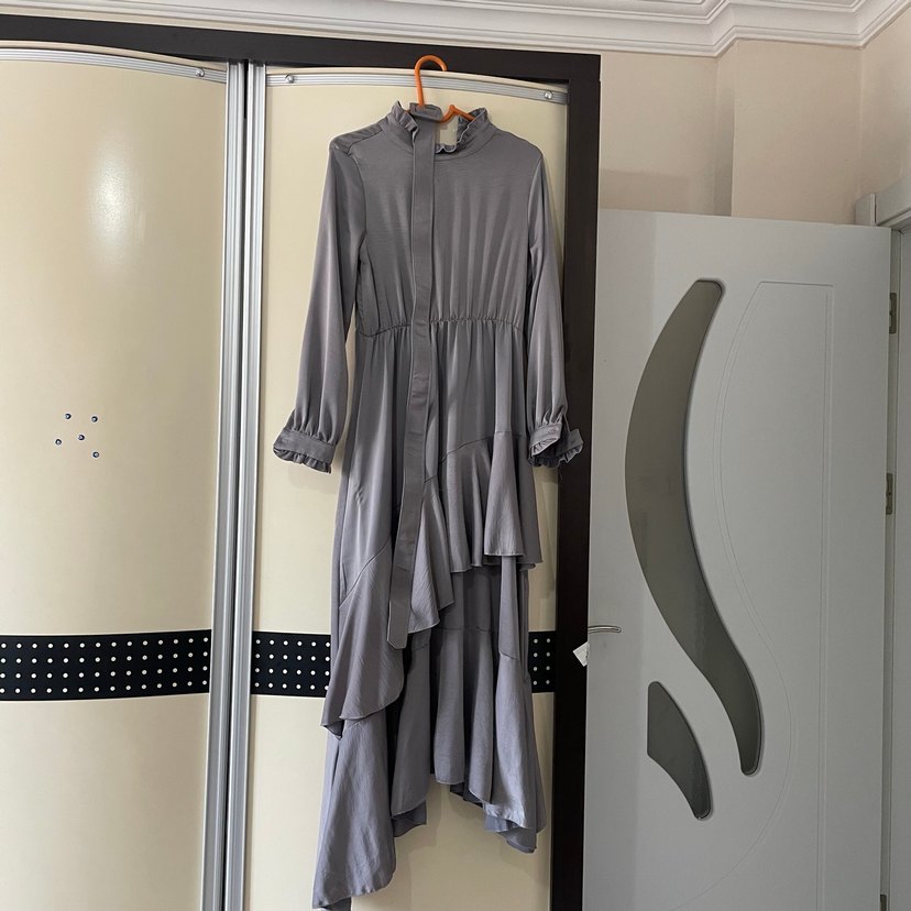 Gri renkte, yüksek yakalı ve bol kesim uzun elbise. Suni kumaştan üretilmiş, pilili detaylara ve volanlı uzun kollara sahip, avangart tarzda günlük kullanıma uygun.