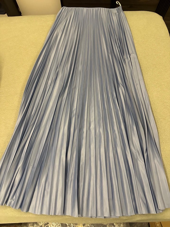 Gri sentetik kumaştan, pilili ve uzun kesimli, şık ve modern bir tarz sunar.