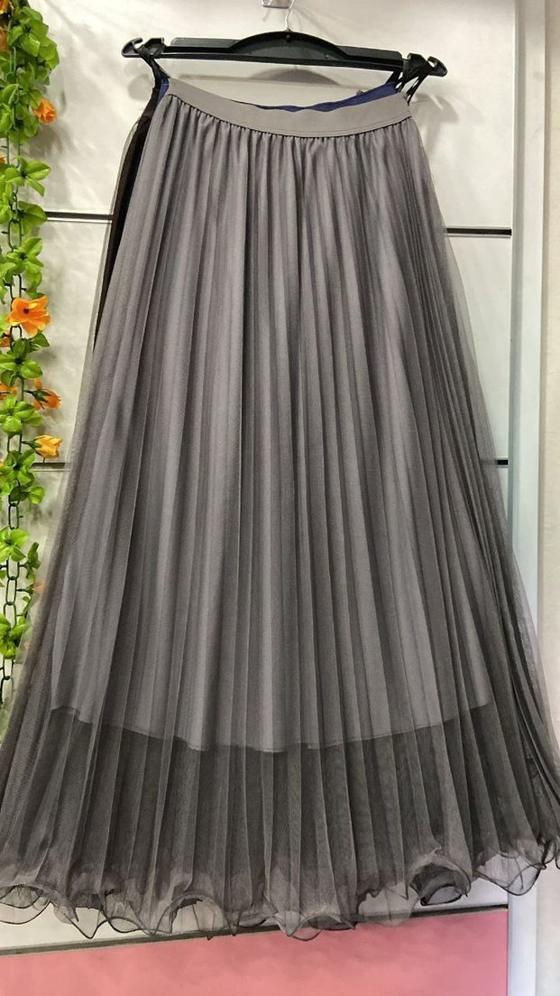 Yumuşak sentetik kumaştan yapılmış, pilili tasarıma sahip uzun gri etek. Düğünler için uygun, rahat ve çağdaş Paris tarzında. Kıvırımlı tül etek Standart 36 dan 44 bedene kadar giyilir Ürün belı lastikli ve içerıye doğru kıvrımdılır standart bedendir etek uçları kıvrımlı Pılelerı mevcut herhangi bir fermuar ve düğme yoktur Astarlıdır Uzunluk 100 cm taşlı olan tarzları da mevcut .