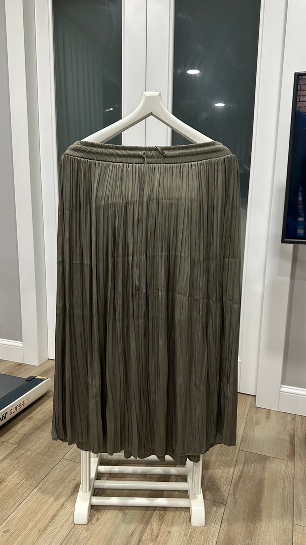 Yumuşak keten kumaştan, bol kesim gri pilili uzun etek. Minimalist ve bohem tarz için uygundur, günlük kullanıma idealdir.