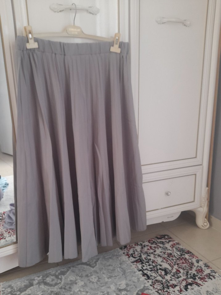 Gri renkli, keten kumaştan uzun pilili ve bol kesim etek. Desensiz ve sade tasarımıyla günlük kullanıma uygundur, Paris tarzı normcore stilini yansıtır.
