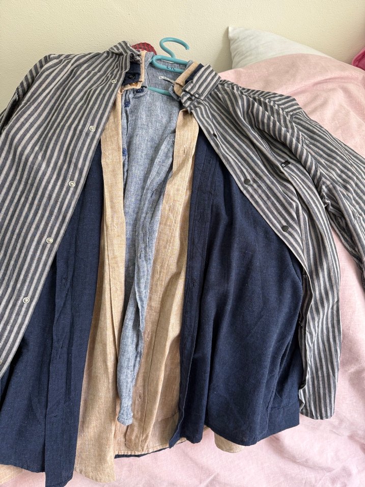 Erkek keten gömlek, ve uzun kollara sahiptir. Gri renkte, bol kesim ve normal midi boyda,