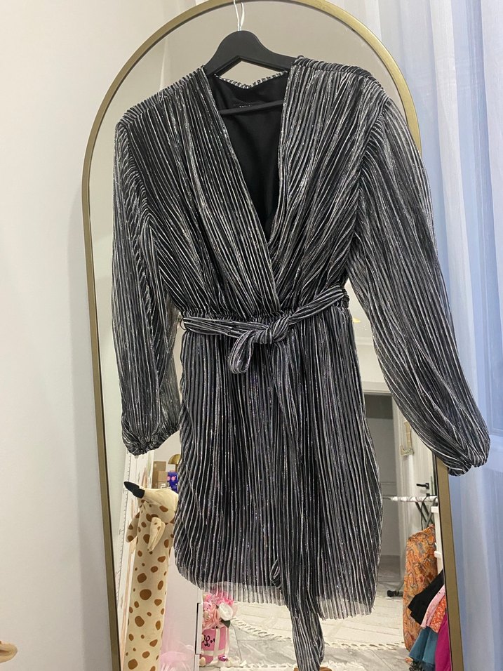 Gri renkte, zebra desenli pilili uzun kollu, bol kesim kadın abiye elbise. Notched lapel yakası ve bağlamalı bel detayı ile romantik akşamlar için uygun.