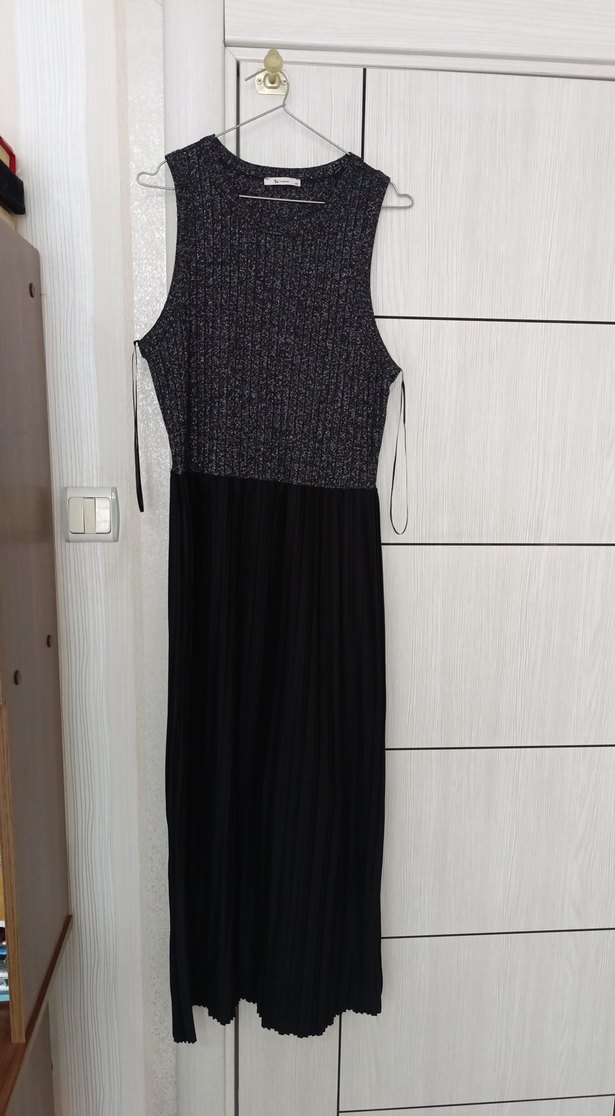 Gri renkte, sentetik kumaştan yapılmış, kolsuz ve straplez yakalı uzun pilili elbise. Günlük kullanım için uygun, regular fit.