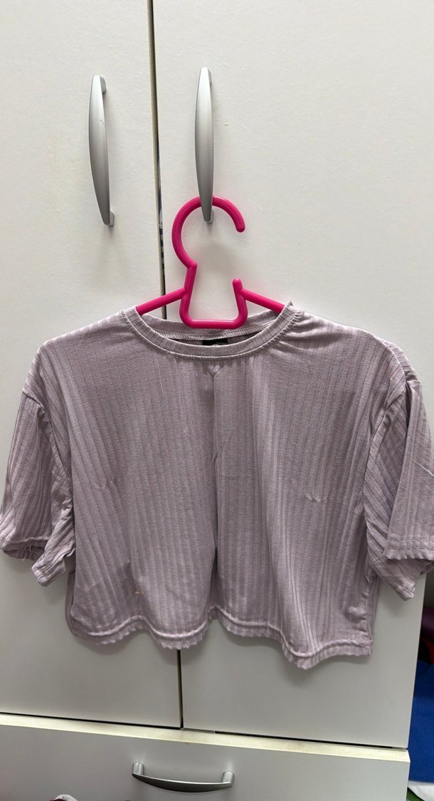 Gri crop top, yuvarlak yaka ve kısa kollu, piliseli detaylıdır. Günlük kullanım için minimalist ve sokak stiline uygundur. ️