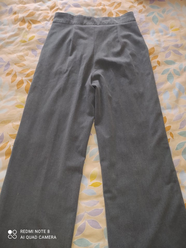 Gri renkte, piliseli midi uzunlukta, sentetik kumaştan yapılmış, regular fit kadın pantolon. Ofis kullanımı için uygundur.