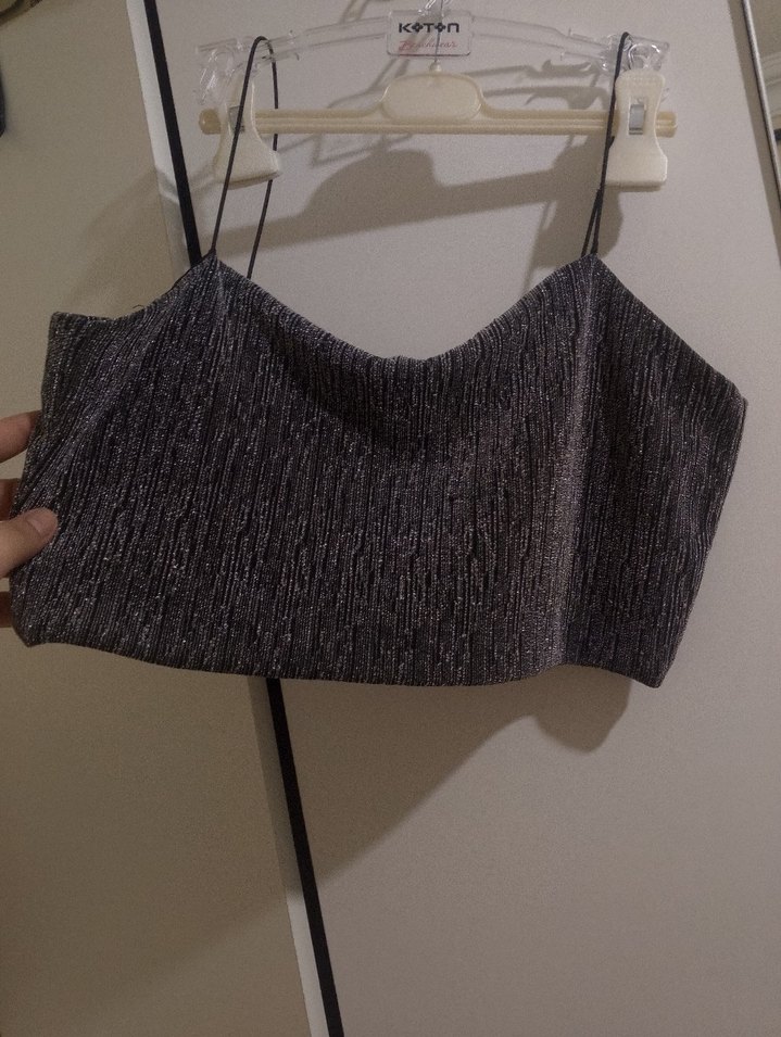 Gri renkli, piliseli dokuda, ince askılı ve kısa kesim crop top. Yumuşak sentetik kumaştan, sokak stiline uygun şık bir parça. ️