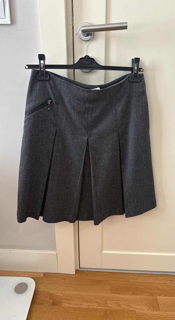 Gri renkte, piliseli ve bol kesim mini etek. Sentetik kumaştan üretilmiş, sade ve desensiz tasarımıyla ofis kullanımı için uygundur. Az kullanılmış