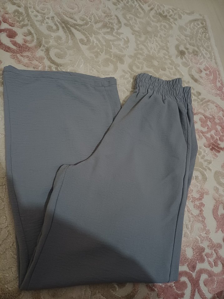 Gri renkte, piliseli ve lastikli bel detaylı, yumuşak sentetik kumaştan üretilmiş, rahat kesim midi uzunluğunda kadın kumaş pantolon. Az kullanıldı, temizdir.