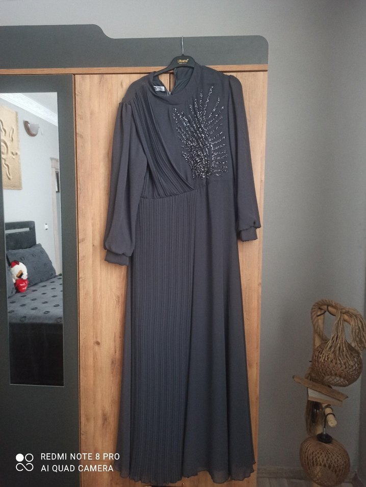 Yüksek yakalı, uzun kollu, bol kesim gri uzun abiye elbise. Piliseli etek ve nakış detaylarıyla sade, mütevazı gotik tarzda, düğün için uygun.