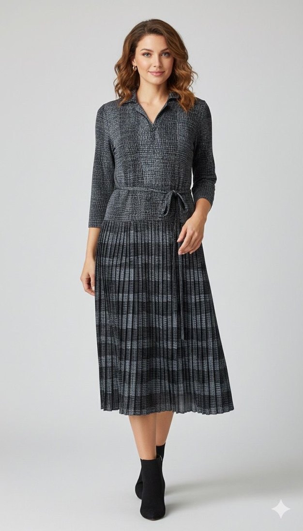 Gri renkte, piliseli etek ve uzun kollu, kayık yaka detaylı uzun elbise. Rahat kesim ve batik desenlidir,