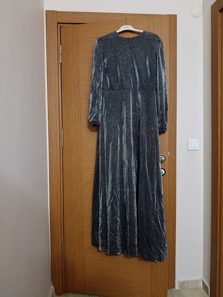 Gri Piliseli Uzun Kadın Abiye Elbise