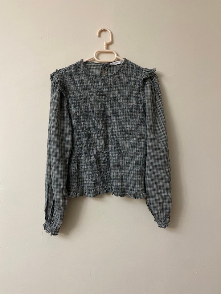 Gri renkte, uzun kollu ve bisiklet yaka keten kumaştan yapılmış piliseli, rahat kesim bir bluz. Günlük kullanıma uygun, trend sokak stiliyle uyumlu.
