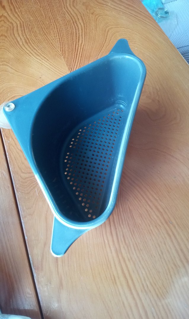 Mutfak lavabo köşelerine uyumlu, delikli tasarımlı gri plastik süzgeç. Suyu kolayca süzer.Yuvarlak lavabo ya uygun değildir.