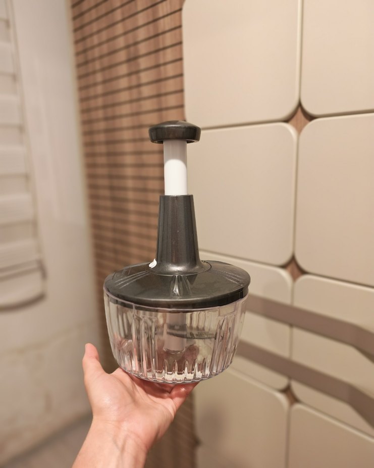 Gri plastik mutfak doğrayıcı, şeffaf hazne ve kolay doğrama için basmalı kulp içerir. Dayanıklı plastikten yapılmıştır.