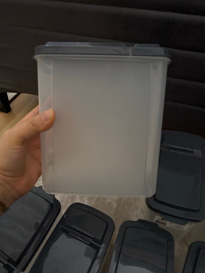 Gri renkli plastik mutfak saklama kabı, kapaklı ve yarı saydam malzemeden yapılmıştır. Kuru gıdaların saklanması için uygundur. 3 büyük boyu 4 küçük boyunun fiyatıdır