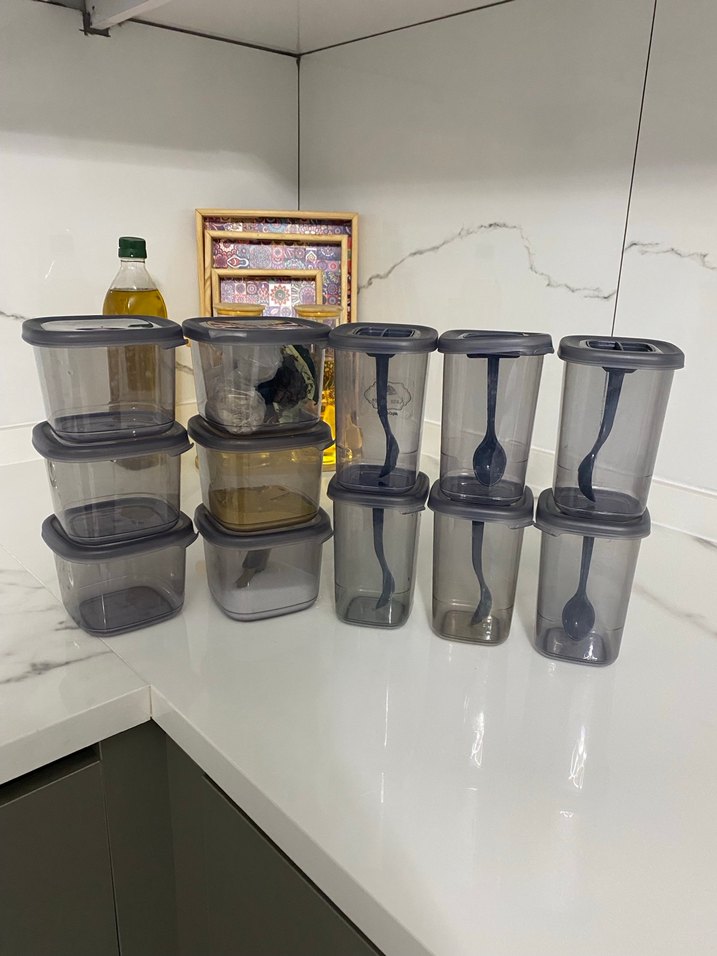 Gri plastik kapaklı saklama kaplarından oluşan set, mutfakta düzen ve gıda saklama için uygundur. Kaplar şeffaf ve koyu gri kapaklıdır.